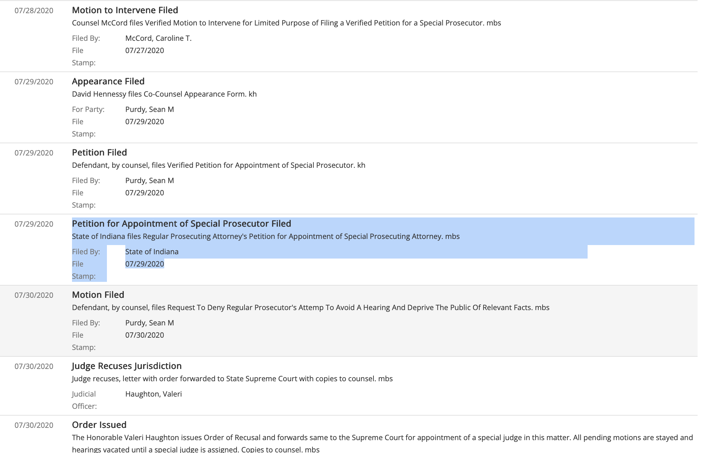If you look at the official court docket from July 29, 2020, the truth is right there in black and white. While the defense did file a petition for a special prosecutor, the very next line item clearly shows that the State of Indiana filed the “Regular Prosecuting Attorney’s Petition for Appointment of Special Prosecuting Attorney.” She absolutely did petition to step down, directly contradicting her own definitive statement on the debate stage.
